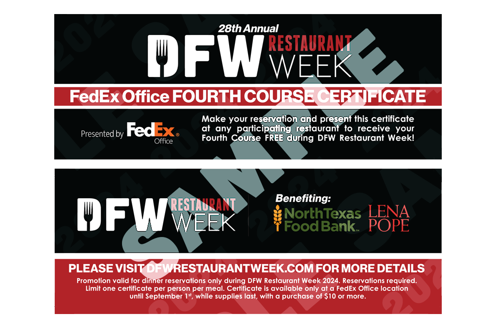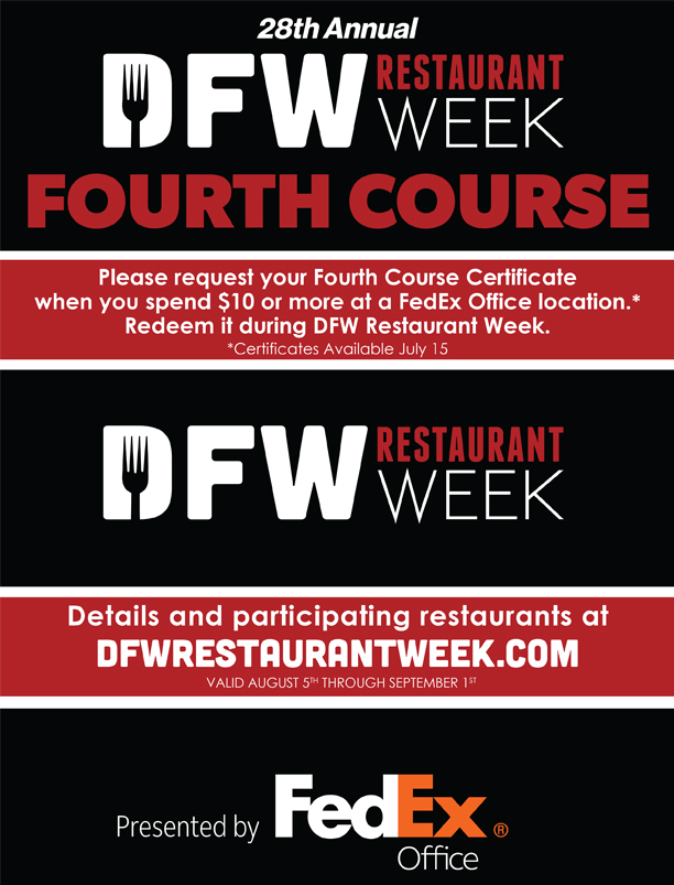 What is the Fourth Course Certificate and how can I get a one? Many restaurants offer a FREE additional “Fourth Course” dinner menu item when you present your Fourth Course Certificate. Beginning July 15, spend $10 or more at a FedEx Office location in DFW to receive a Fourth Course Certificate at the register with your qualifying receipt. Check out restaurants offering the Fourth Course on the official DFW Restaurant Week list.